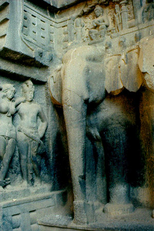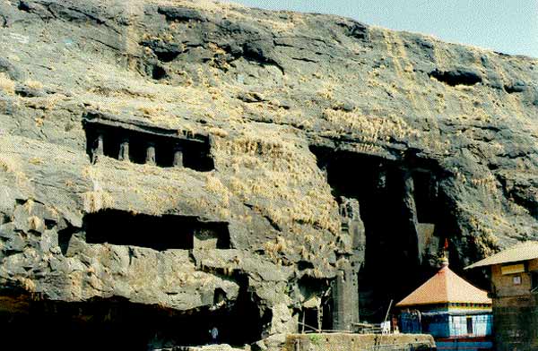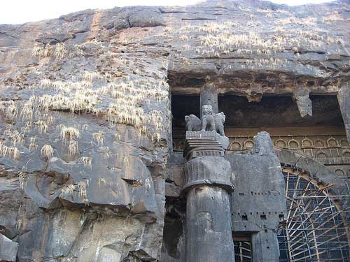 Karla Caves is an complex of ancient Buddhist Indian rock-cut architecture cave shrines built over the period of 3rd to 2nd century B.C. Even though the caves were constructed over a period of time and the oldest one is believed to date back to 160 BC. Located in Karli near Lonavala, Maharashtra, the caves are on an major ancient trade route, running eastward from the Arabian Sea into the Deccan. Karli's location in Maharashtra places it in a region that is the division between North India and South India.Buddhism, having become identified with commerce and manufacturing through their early association with traders, tended to locate their monastic establishes in natural areas close to major trade routes so as to provide lodging houses for travelling traders. The Caves are high on the surrounding hills. A narrow winding path leads up. Built centuries ago by Buddhist monks, the caves are in keeping with the Buddhist ideas of simplicity. One wonders why this isolated spot was chosen as the site for the caves. After all, a rock-cut structure high in the remote hills is not something immediately associated with a place of worship. Until the arrival of the Buddhists, there had been little building activity of any consequence in this difficult terrain. During their very first season in the hills in thatched huts, the monks must have had to face the fury of the rains. Rains, which lashed down the hillside non-stop for half the year. Rains that could wash away an entire village without leaving a sign and rains that could make worship around a stupa in the open an unpleasant task indeed. Under the circumstances, they could have built prayer halls of timber. Wood was at hand from the forest. Bricks baked in the plains could be hoisted up. However, even such a hall would have been difficult to maintain and preserve under the unrelenting fury of the monsoon. Only the hills seemed to withstand the ravages. With their great desire to make the Good Law of the Buddha outlast time itself, the Buddhist monks decided to carve their sanctuaries out of the living rock of the immovable mountains. |