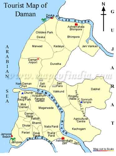 Daman: A Portuguese colony till it was liberrated in 1961. places of interest include Moti Daman Fort, light House, Gandhi Park & devika Beach. Silvasa: Also situated in vicinity is this tiny, sleepy town, with lush green forests, large water front & a gorgeous kaleidoscope of flora & fauna. Sightseeing includes Bal Udyan- a children's park with a mini zoo, Tribal Museum etc. Vapi:An industrail town in the region. If you are fond of visiting good sea beaches all around, you must visit State of Gujarat in India. There are around 8 to 10 such beautiful beaches in the Southern part of Gujarat. Daman is one such sea beach that attracts thousands of visitors from all over the country and abroad. Daman has all the positive aspects that a good sea beach must have. It has endless open sea, the beautiful sand, and the lovely trees on the seashore. There are no rocks or deep pits on the beach of Daman making it very safe for the bath. Daman falls under the Central territory under the rule of central government of India. |